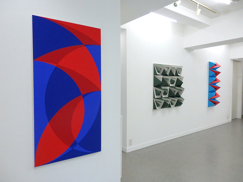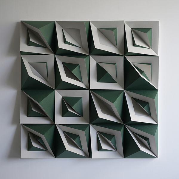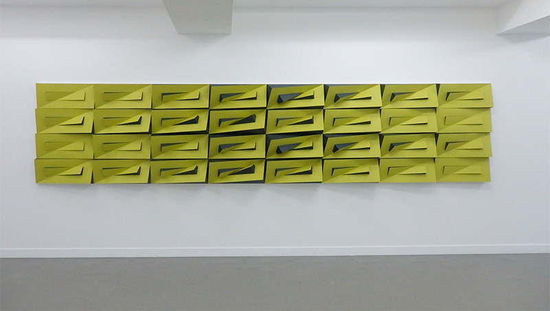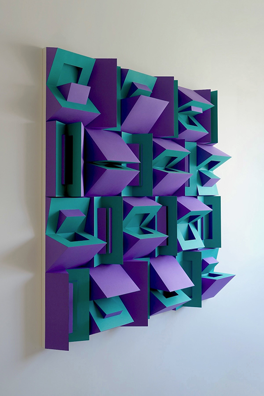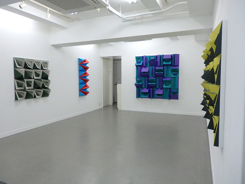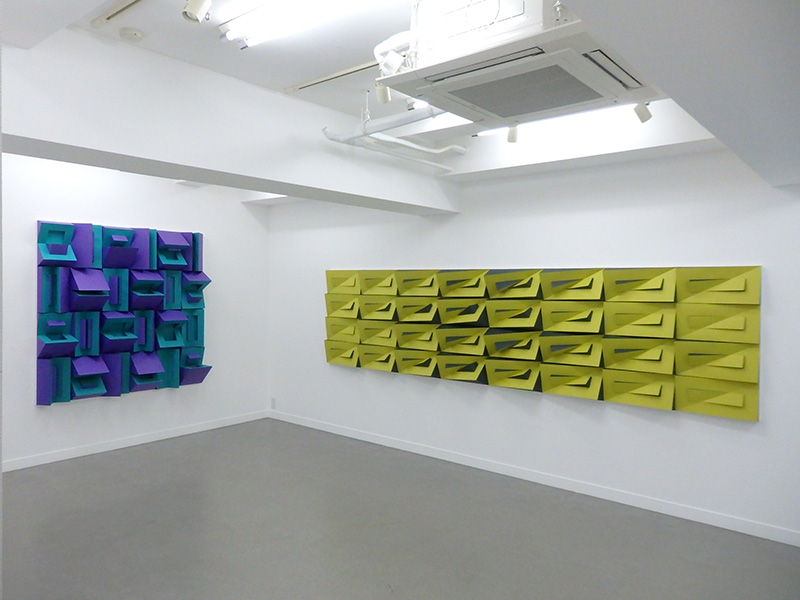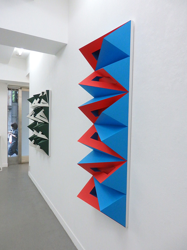 紙立体によるユニットを充填した半立体作品。ユニットは1枚の紙に切り込みを入れて立ち上げ、生じた隙間を別の色の紙で塞いで作成する。この条件下で得られる構成の展開を探った。